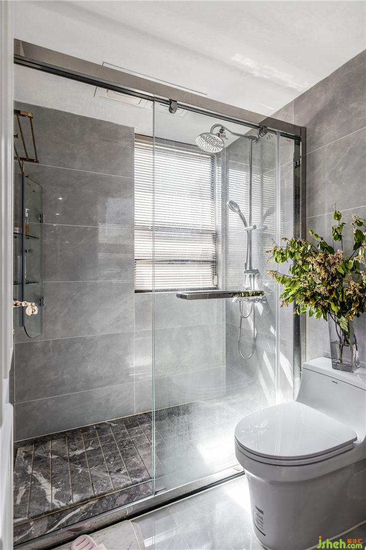 客卫的整体用色,就是素雅简约,浅灰色的墙砖,深色易打理的地砖,经典的配色组合。