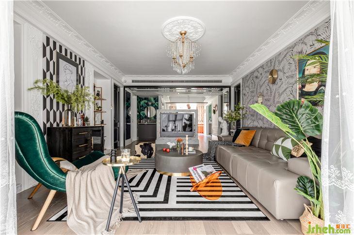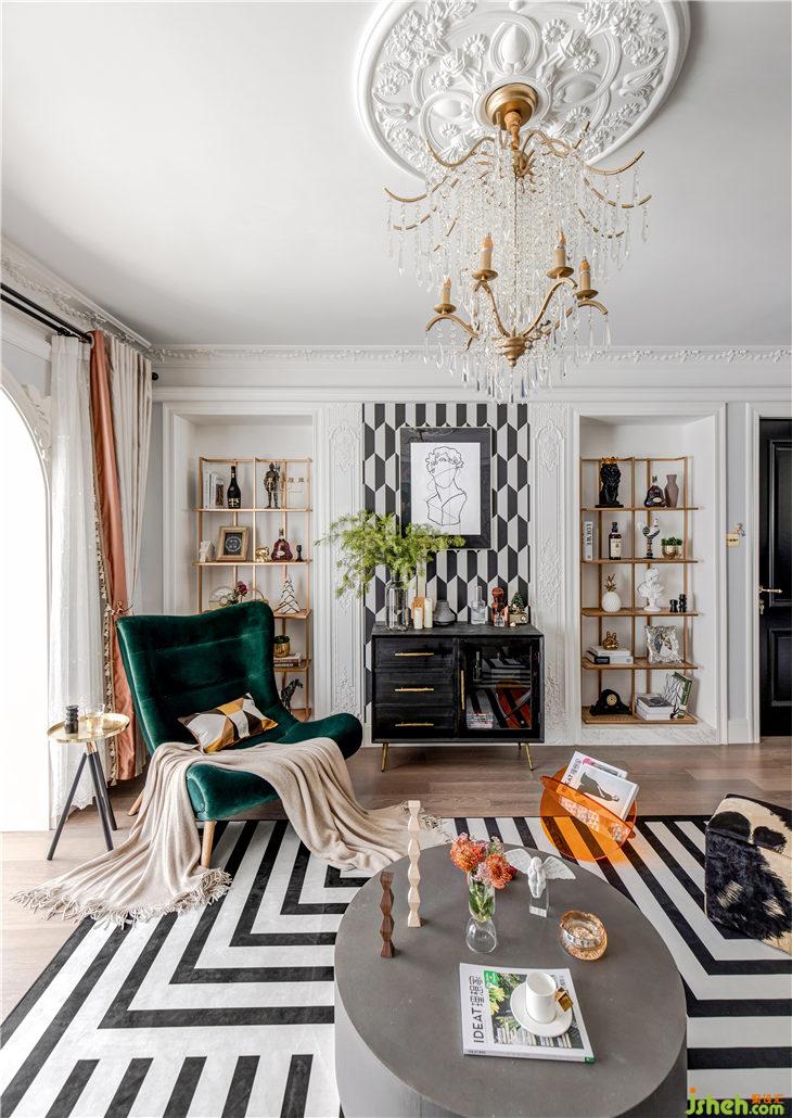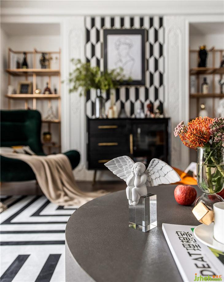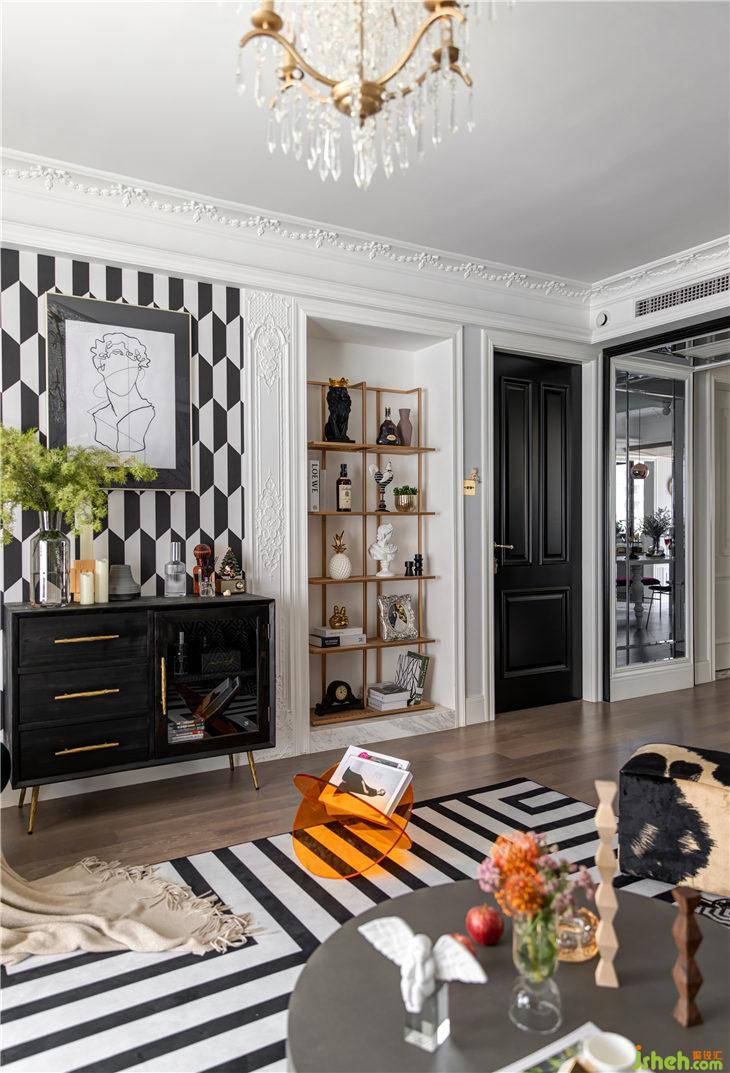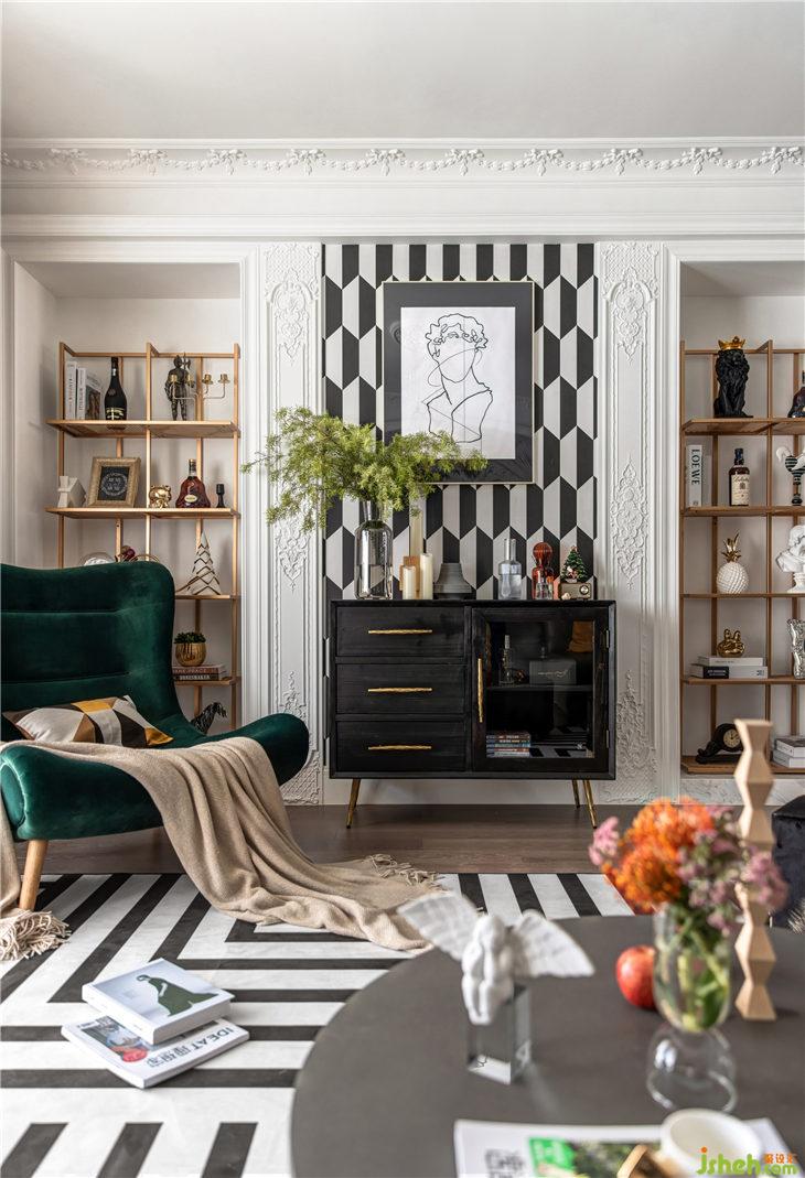 中间是英国Cole&Son 进口墙纸几何图案 型号是:黑白色 105/12050,与黑白条纹的地毯琴瑟和鸣,中间的大卫简笔艺术画,香槟色的画框,提升了这面背景的艺术气息。黑色复古边柜沉稳不张扬,沉淀了客厅的摩登气质。