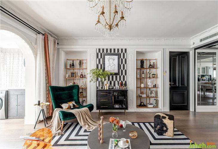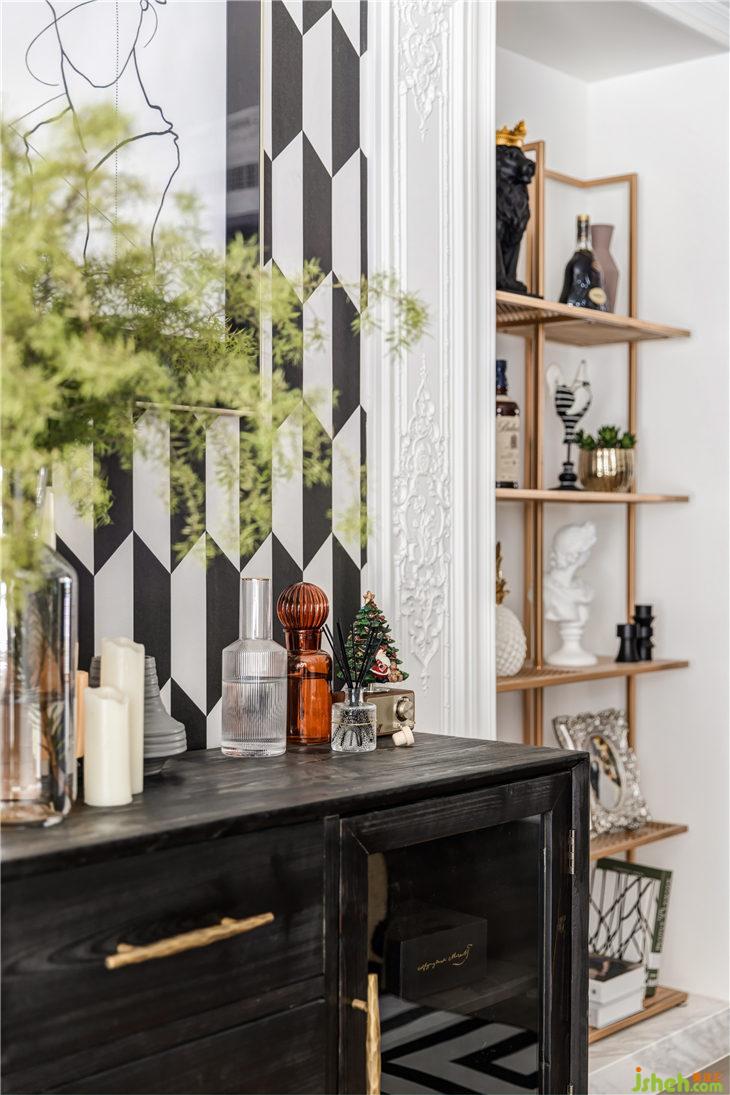 与主卧相连的这道墙进行了凹凸组合,凹进去的空间,正好抬高做两个内嵌壁龛,放置金属展架,业主很多心爱的小摆件,和出去旅游淘回来的软装,名品酒水,组合成列,也成为客厅的一道独特的风景线。