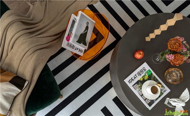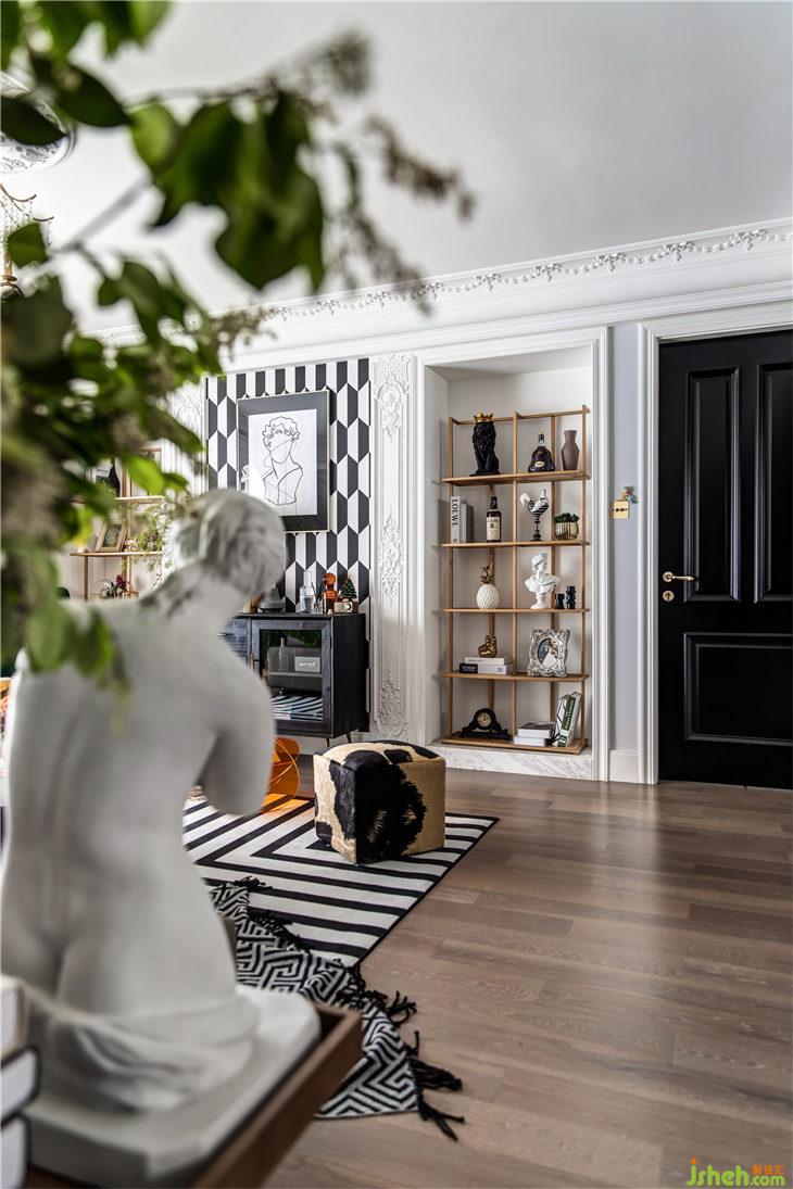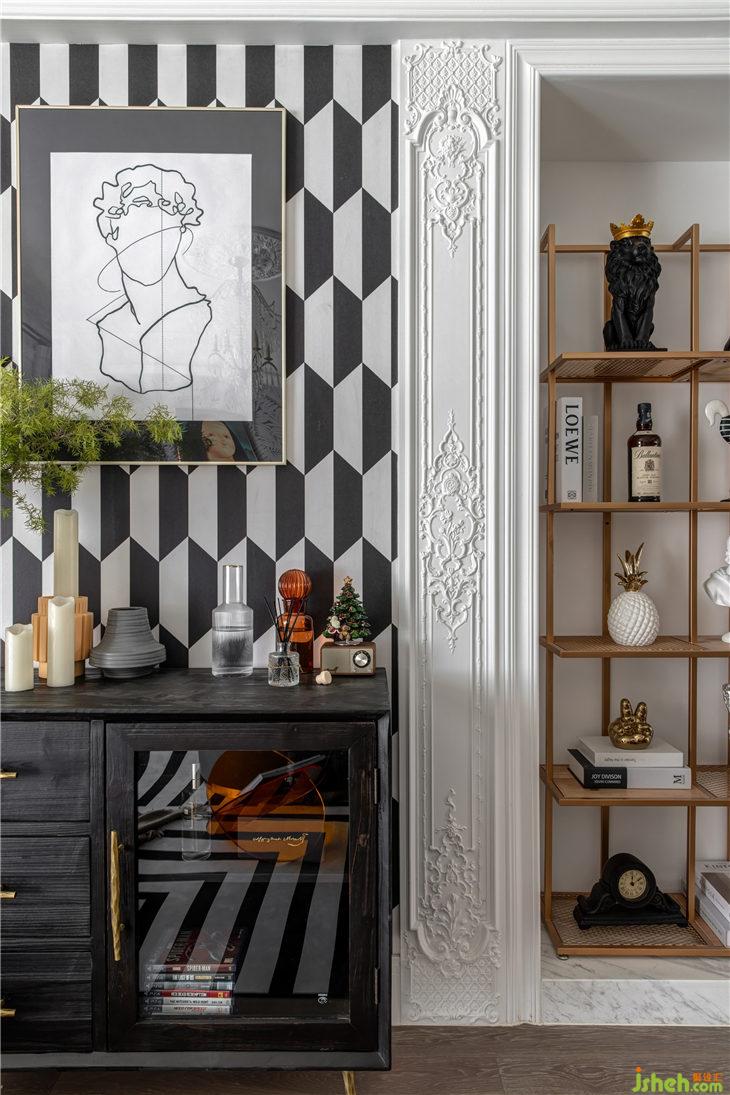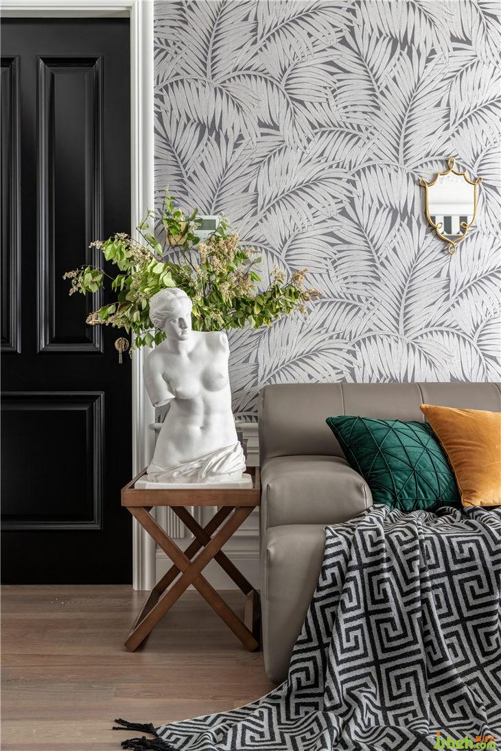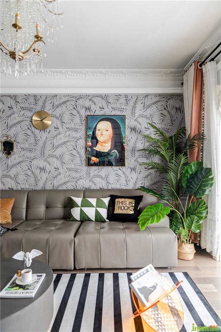 沙发背景是比利时ARTE 进口墙纸壁纸, 型号是75207,凹凸有致的纹理,精美而又典雅。古典优雅造型的铜镜+现代极简挂钟,现代与古典的碰撞,彰显了气质的完美统一。