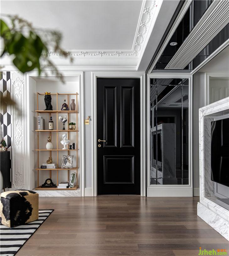 旋转电视架上方正好是客餐厅放置空调的位置,利用宽门套结合车边灰镜效果进行视觉拓展,让原本客厅最低点的过道视野得到扩展,定制长的整段白色出回风口,比例完整贴合。同时,这块采用外黑100mm的大门套框内套60mm长方形白色内框组合,与客厅两个卧室门的色彩搭配反差交融,整体统一又富有古典韵味的细节,使这块交接空间的层次进行了气质上的升华。