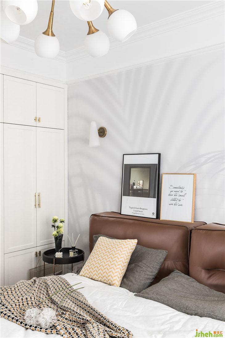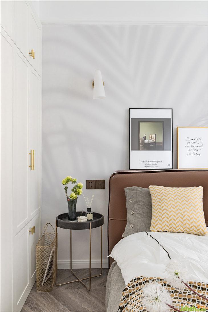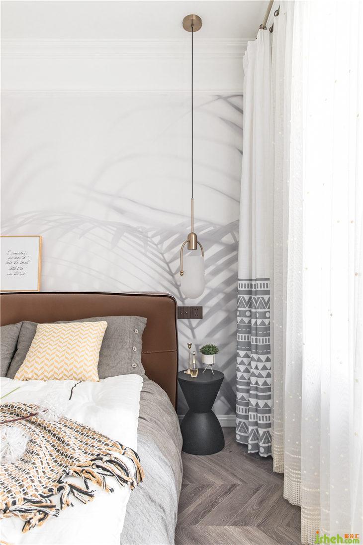令人舒适的主卧空间,没有过多的装饰表现,淡淡的枝叶剪影素色壁画,大面积留白的墙面,为的是一份慵懒撒入室内的阳光及那还在追逐的梦想。