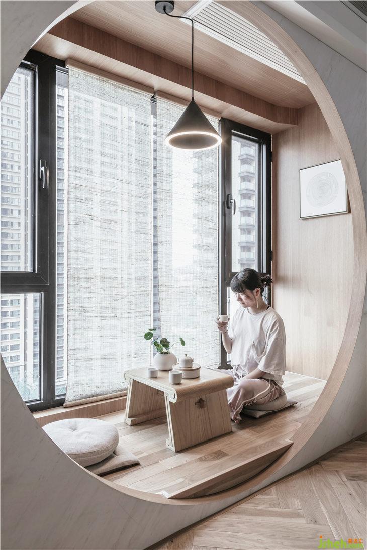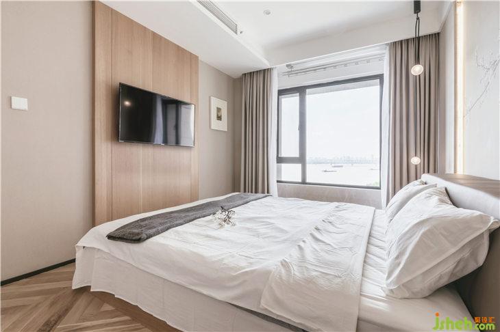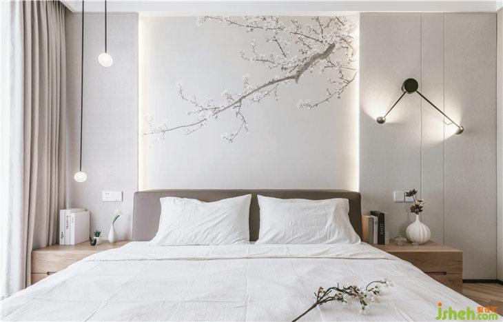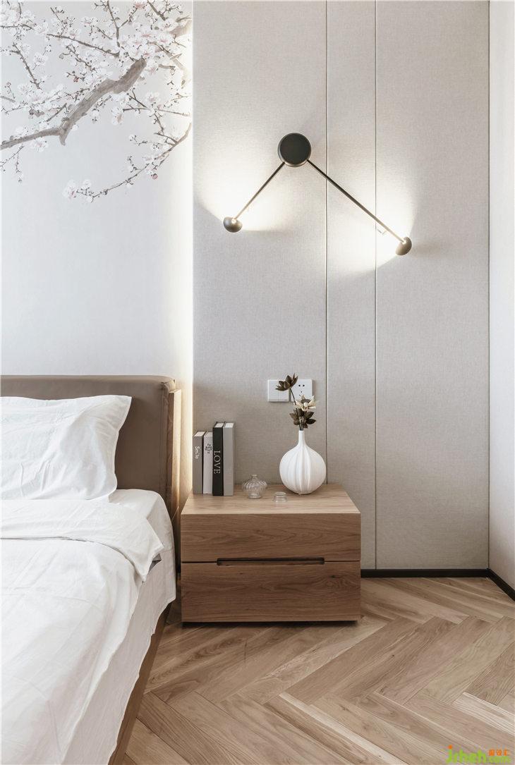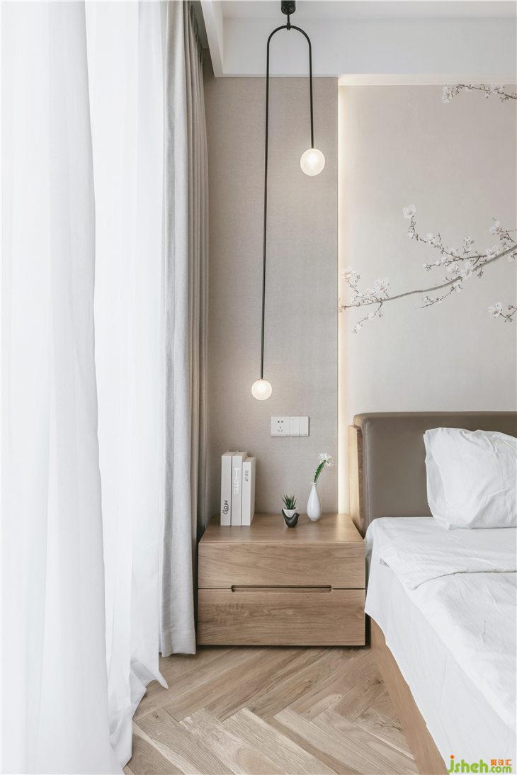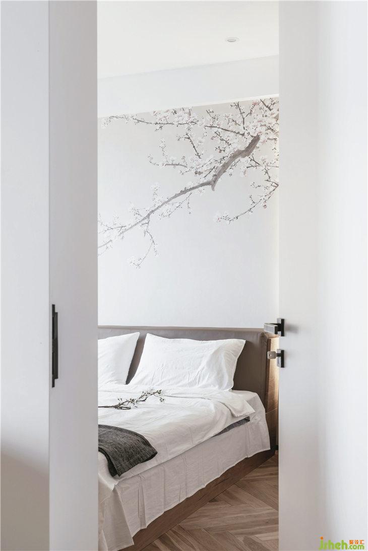 主卧地面延续客厅的人字地板铺贴,背景墙使用硬包并抽竖缝,与客餐厅背景墙的抽缝相呼应;两个床头柜上方,选用壁灯和吊灯的不对称设计,使得空间更加活跃灵动,床背景中间点缀梅花枝叶壁画,一幅东方禅意之美应运而生,主卧右侧内藏了一个完整的衣帽间,延用了日式隔断移门无地轨的设计,这几处门的设计又恰到好处的诠释了我们的风格定位。