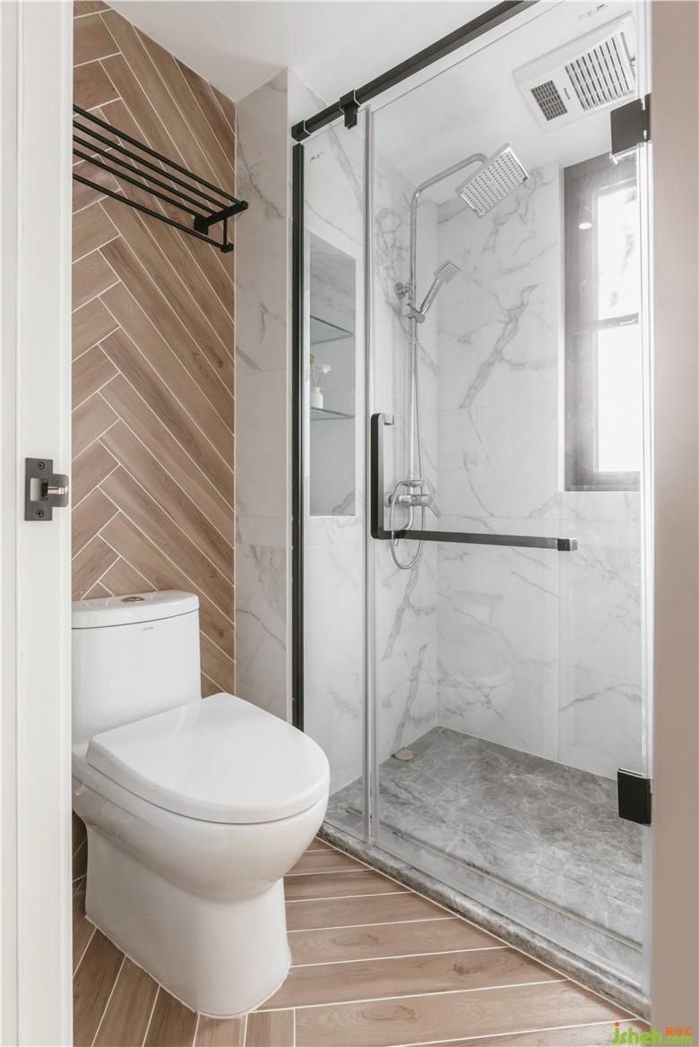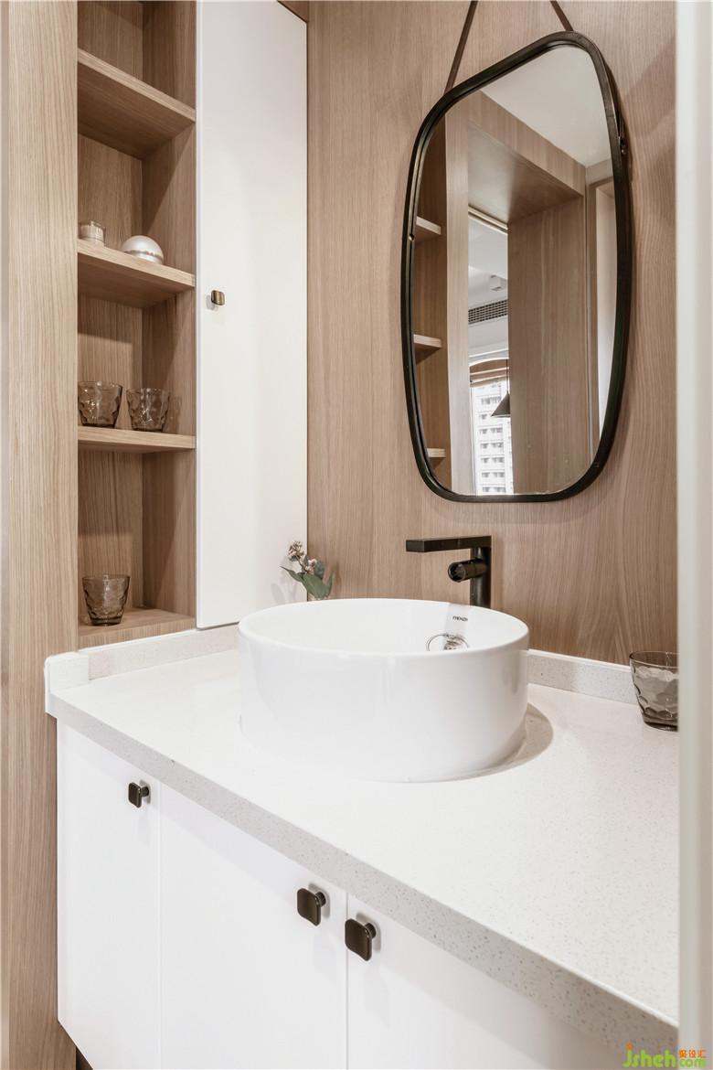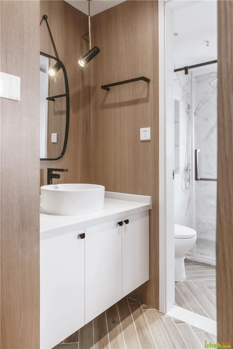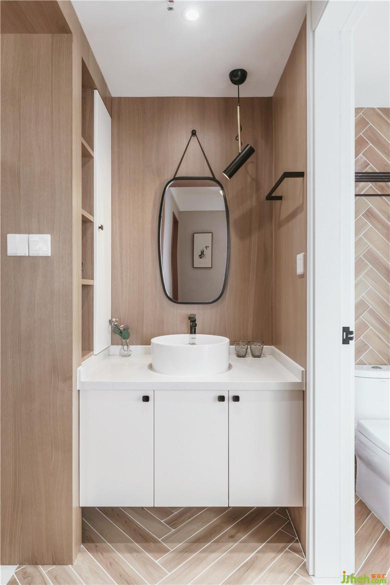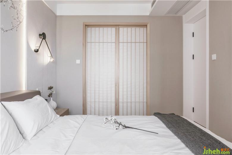 客厅地面铺设人字地板,门套以及移门皆使用和室风格的木质材料,沙发背景墙白色护墙,竖向抽缝,与主卧门材质统一,融为一体