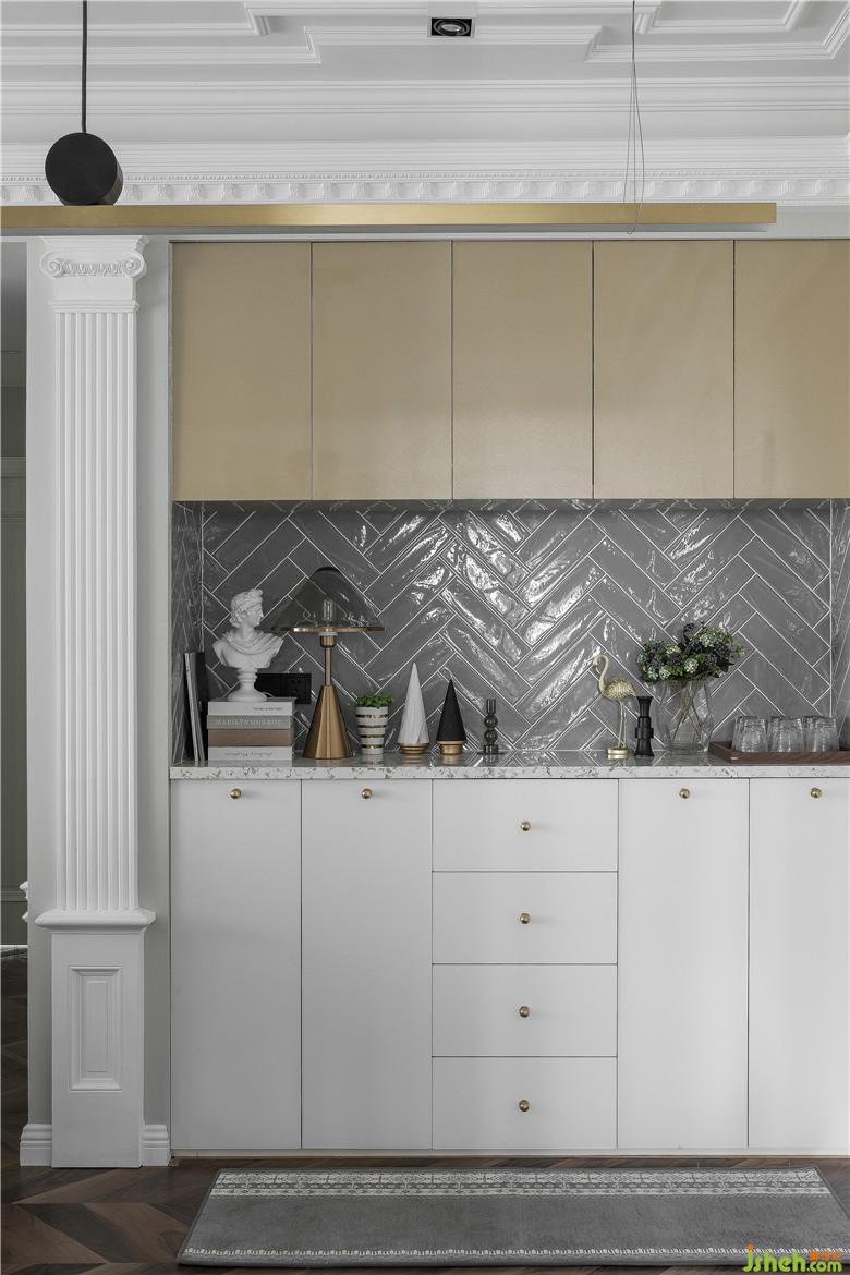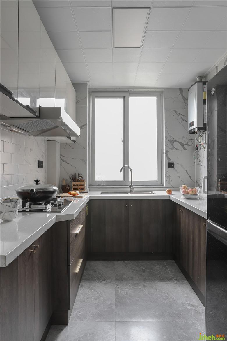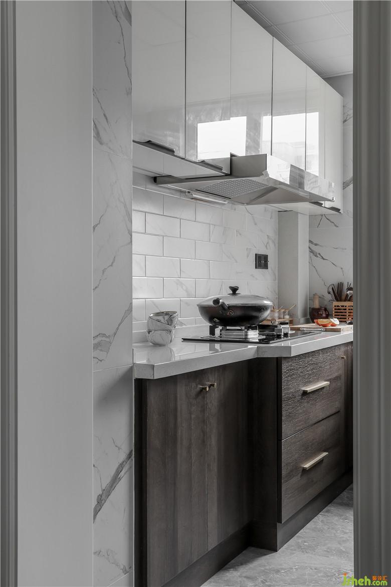 厨房空间有限,室内设计师拓展了厨房使用面积,用无地轨移门形式,方便老人使用, 利用隔墙增加了入户鞋 柜存储空间。