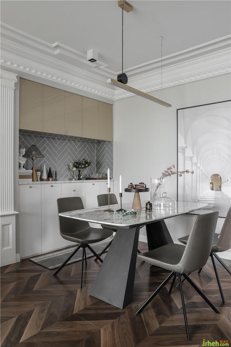 客餐厅保留原始空间,餐厅侧墙取消,餐边柜内置,增加便捷功能性。