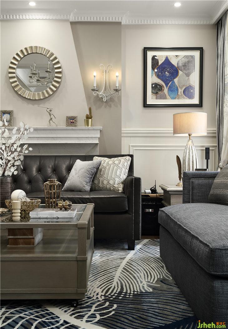 客厅沙发背景采用三个层次,白色背景护墙板、米咖色乳胶漆叠级、梯形大理石整体壁炉。背景壁炉造型分为两个部分,下部设计大理石台面用来摆放软装饰品;上部凸出的梯形造型搭配圆镜,复古稳重。两侧复古的烛台壁灯与客厅主灯相得益彰。