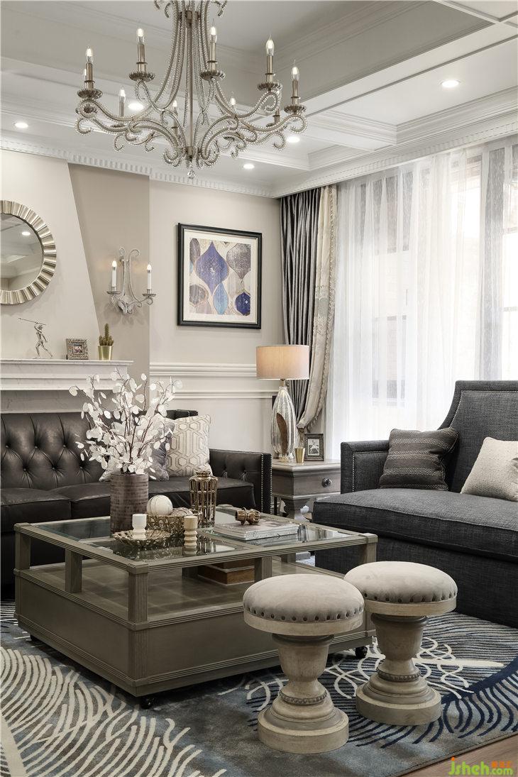 客厅顶部的十二宫格造型增加了空间的层次,同时巧妙的隐藏了原始建筑梁体和出风口。沙发背景以简约的美式壁炉为背景墙,背景墙下半部分为白色护墙,上半部分为灰色乳胶漆饰面,不同层次之间的微妙变化更显精致。家具、抱枕、陈设品色调统一和谐,静谧美好。