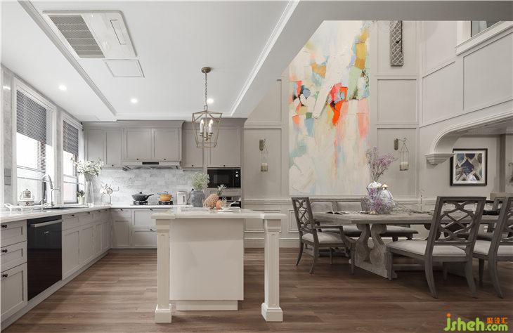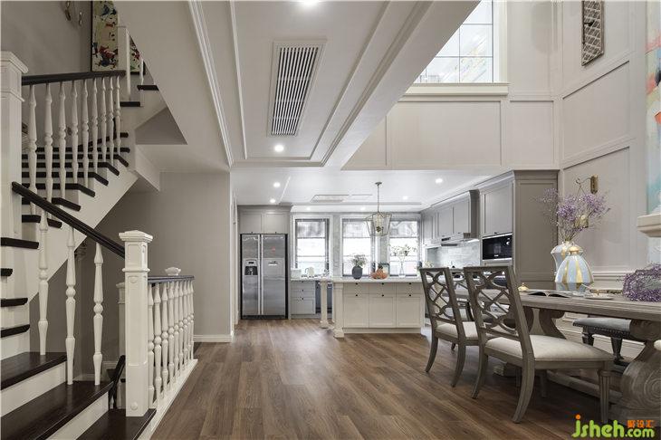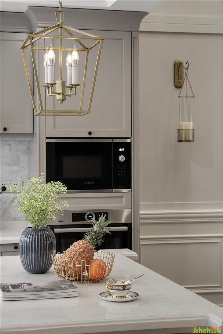内嵌的电器高柜美观大气,与餐桌位置相邻,方便厨房与餐厅空间的使用。
