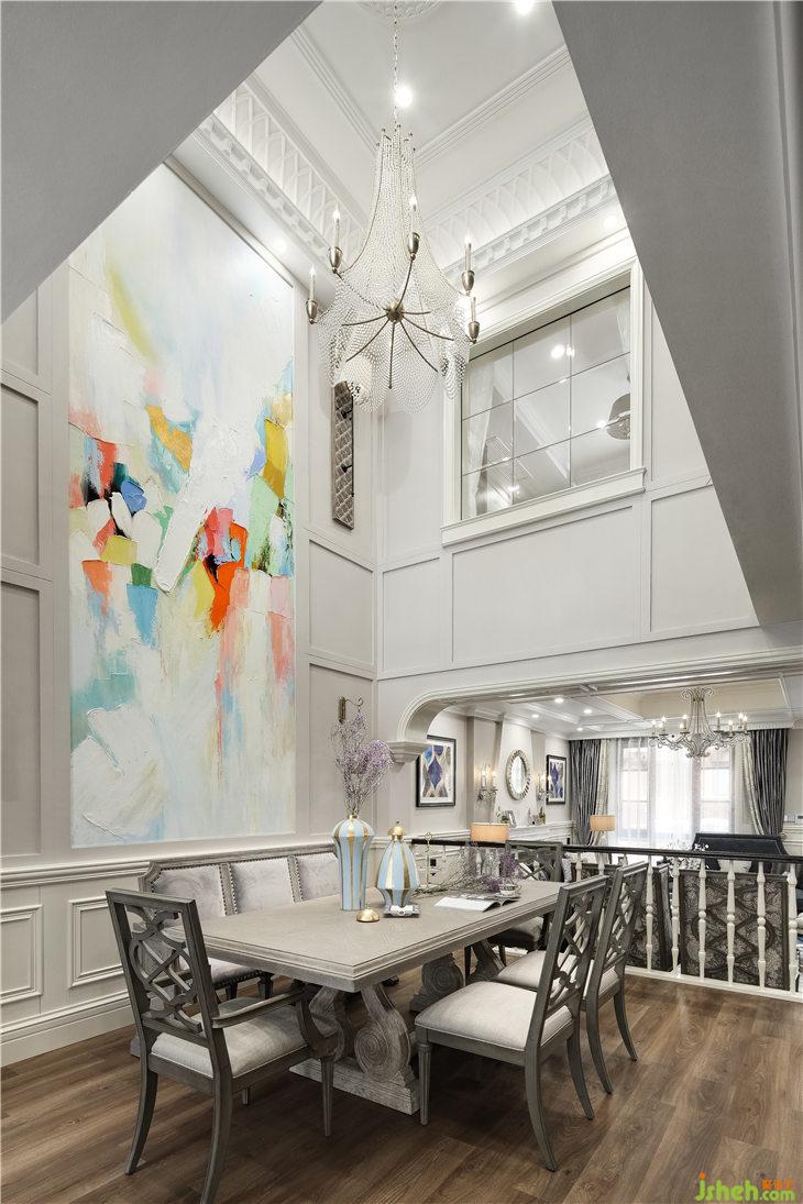 餐厅的挑高空间是房子的亮点,穹顶造型多层次的细节描绘出餐厅恢弘的挑高气质,3m大水晶吊灯在各方位角度点亮了晶莹剔透的气质。二楼两侧分别是次卧和孩子的学习房,为了保证餐厅的采光,我们使用固定的超窄边框玻璃窗。餐厅背景是一幅定制的抽象壁画,潇洒的笔画搭配明度较高的颜料,在整个灰度空间绚丽夺目。