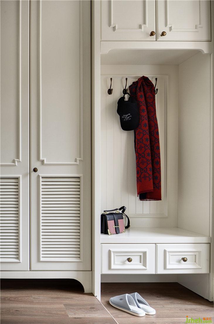 右手边设计了鞋柜和换鞋凳的组合,下方挑空,常用的鞋,可以直接储放,临时的衣帽随手悬挂。左手边设计了穿衣镜,出门时,整理下衣着就可以美美的出门啦。