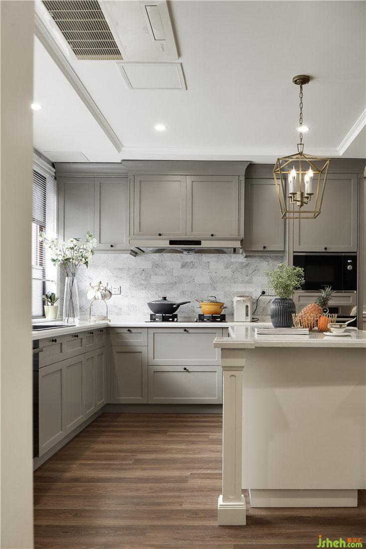 一进门,开放式厨房便映入眼帘。墙面大理石瓷砖纹理精致耐看,灰色系的橱柜柔和淡雅,L型台面加上岛台操作空间十足。岛台下方做成柜体,增加了厨房的整体收纳。