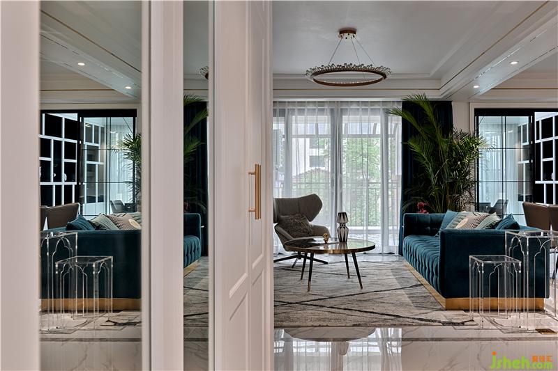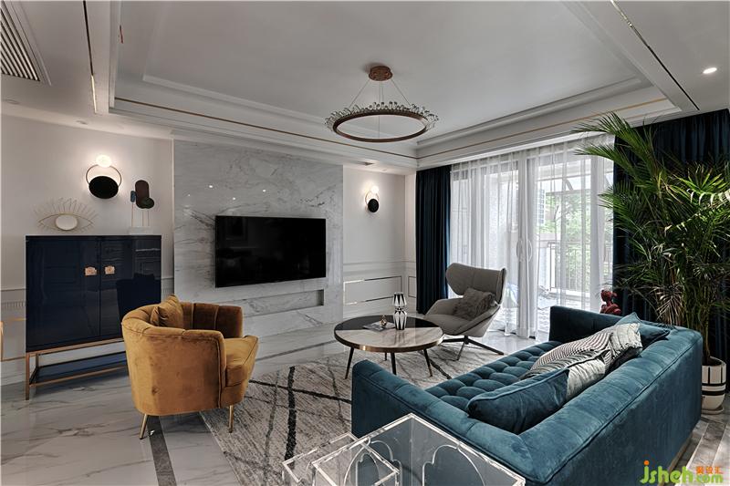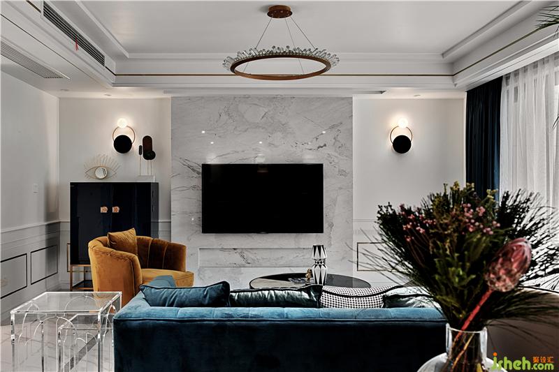 轻奢风格中常用的材料,如大理石、黄铜元素、丝绒、皮饰、瓷砖等,都可以经过巧妙的混搭与组合,让空间的奢华感上升到一个新的高度,打造出深受年轻人喜爱的现代家居。比较基础的大理石瓷砖搭配大量的金属元素、石膏线条,再加上一些闪亮的装饰元素作为点缀,轻松、优雅、知性,又能很好体现出轻奢风格之美。