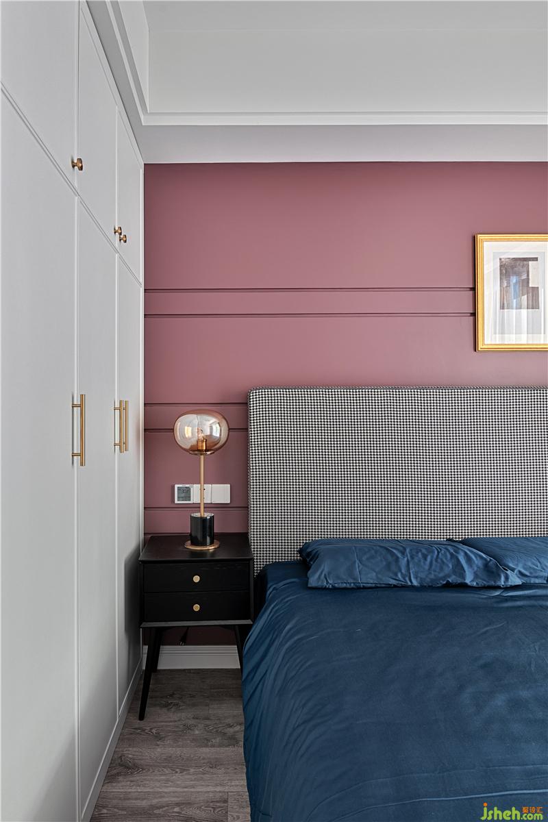 次卧的配色稍显清新一些,靠头墙面采用了比较流行的脏粉色,与千鸟格床相呼应。