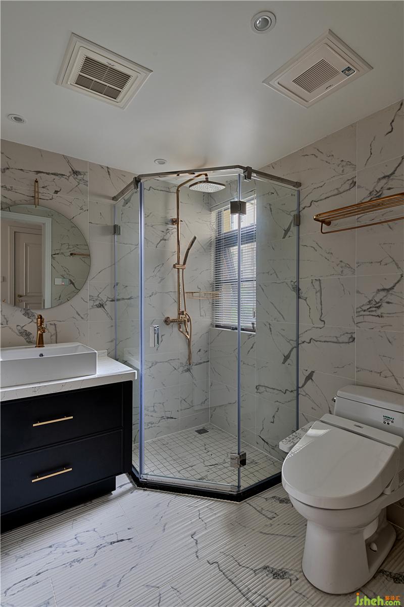 卫浴空间色彩搭配干净,干湿分离将淋浴区与其他功能区域进行划分,既可保持卫浴场地的干燥卫生,又能维持浴室整体环境的整洁美观。