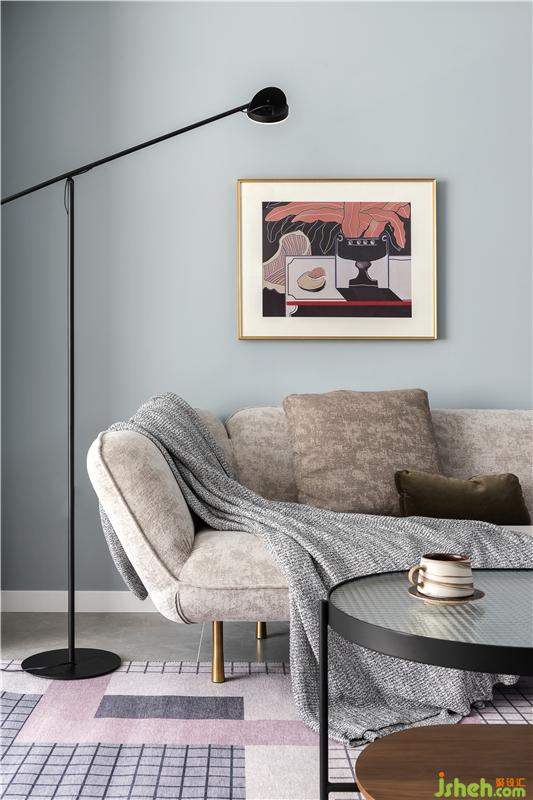 沙发墙以乳胶漆打底,结合金色包边的装饰画和铜色的壁灯,将轻奢优雅的调性发挥到了极致。阳台是打通的,结合大面积的落地窗,让空间显得更为敞亮。