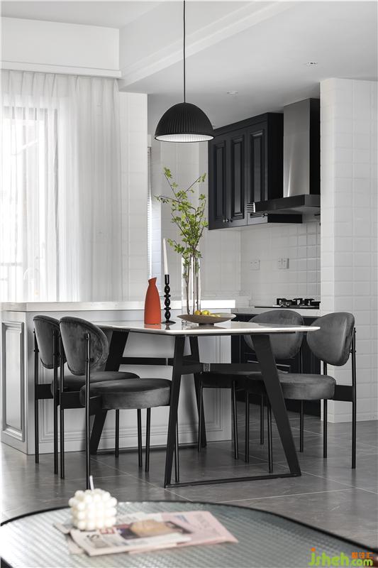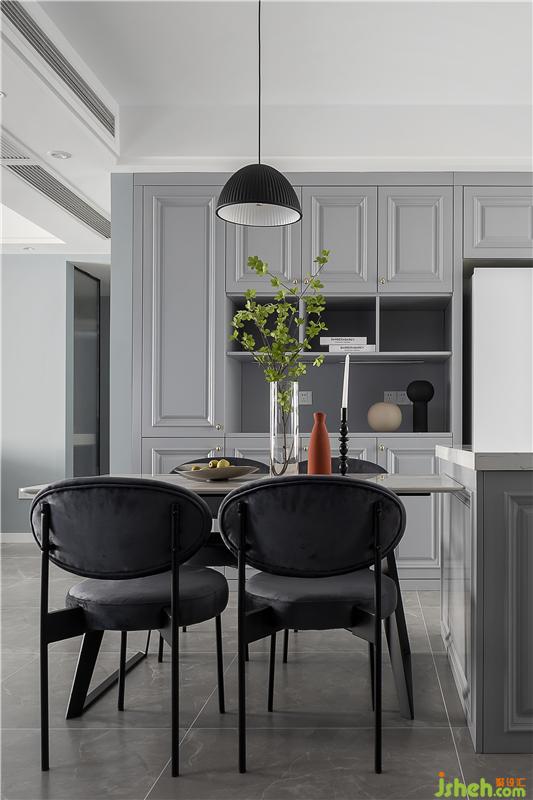 餐桌椅简约而不简单,深色的结构有着美式独有的沉稳气质。线条感十足的美式柜子,再辅以装饰画和桌面的绿植插花,就餐氛围瞬时优雅起来。