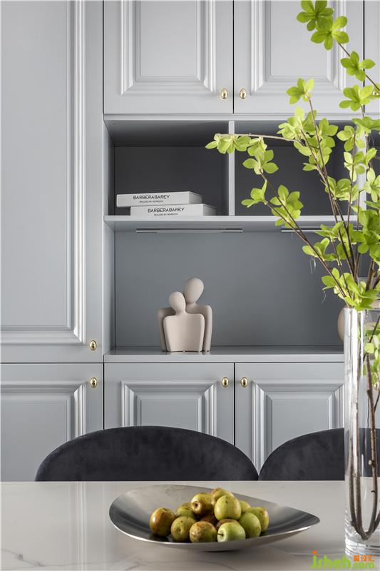 餐厅与生活阳台相连,采光十分通透。餐柜的设计,不仅解决了最基本的收纳问题,而且还提前预留了一个冰箱位,加上利用矮柜布置的操作台,实现了强大的使用功能。