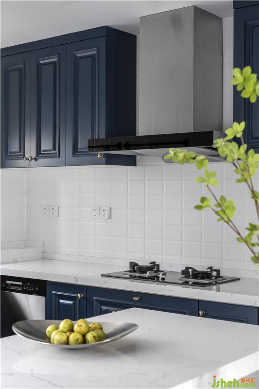 来到厨房,清新的色彩搭配耳目一新。简约的橱柜搭配浅色墙砖和石英石台面,经典而耐看。