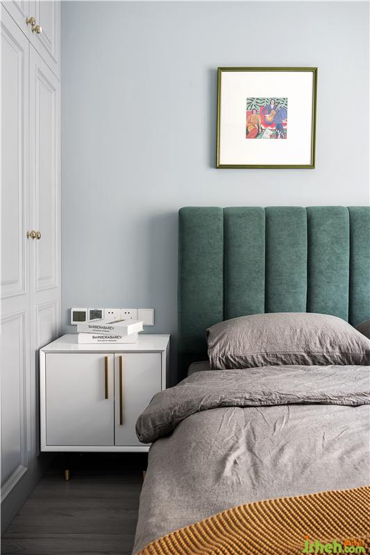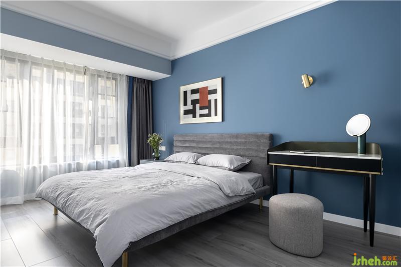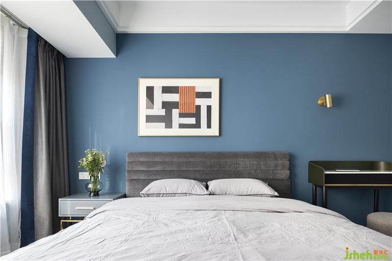 蓝色的背景墙加上简约的装饰画,清新而大气。深色的简约大床呼应睡眠空间的整体风格,更显稳重大方。