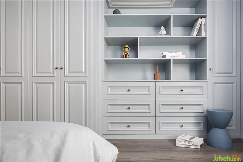 主卧连接着衣帽间,动线设计方便,白色衣柜款式美观大方且储物空间惊人。女主人说自己特别不喜欢生活用品裸露在外,所以收纳需求较大。