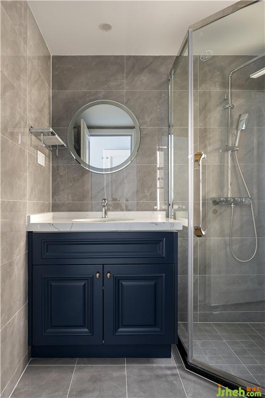 卫浴空间墙面铺满鱼骨形状瓷砖,结合圆镜和蓝色的抽屉柜,优雅之感应运而生。