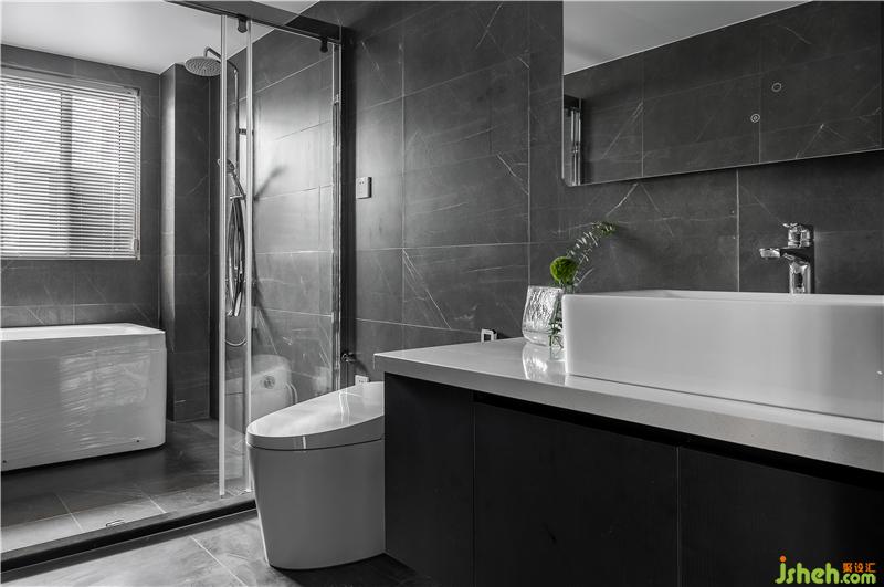 主卫是二分离设计,黑白色搭配出简约高级感。一天劳累后躺卧在大浴缸里泡个热水澡,冥想静思,舒畅自由。