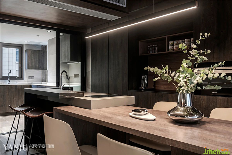 岩居设计把岛台与餐桌连接到一起,且根据居住者身高做了吧台、操作台、餐桌三个尺寸的深化。