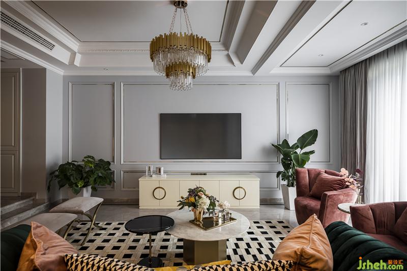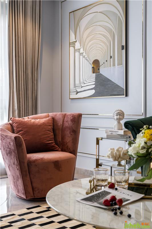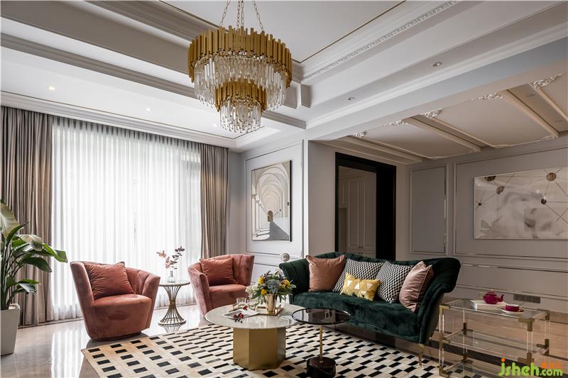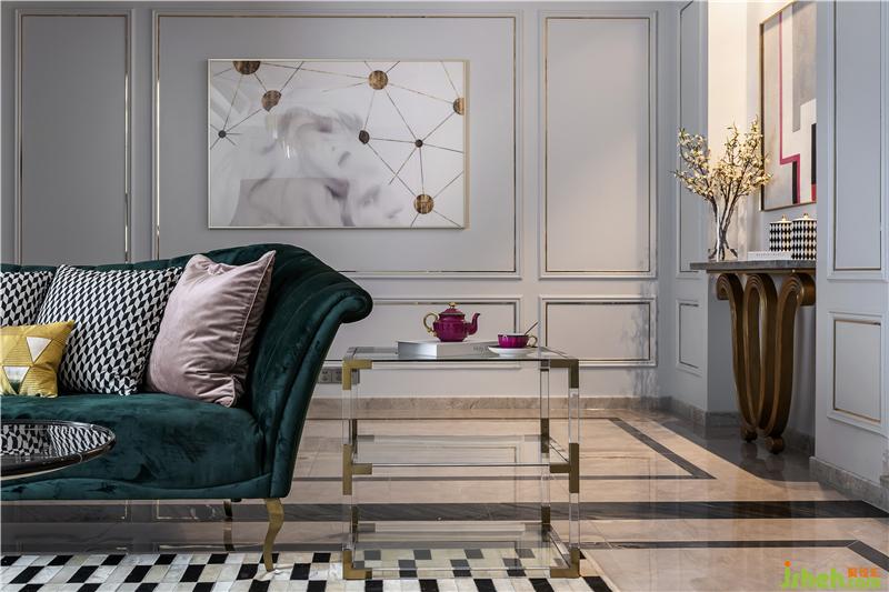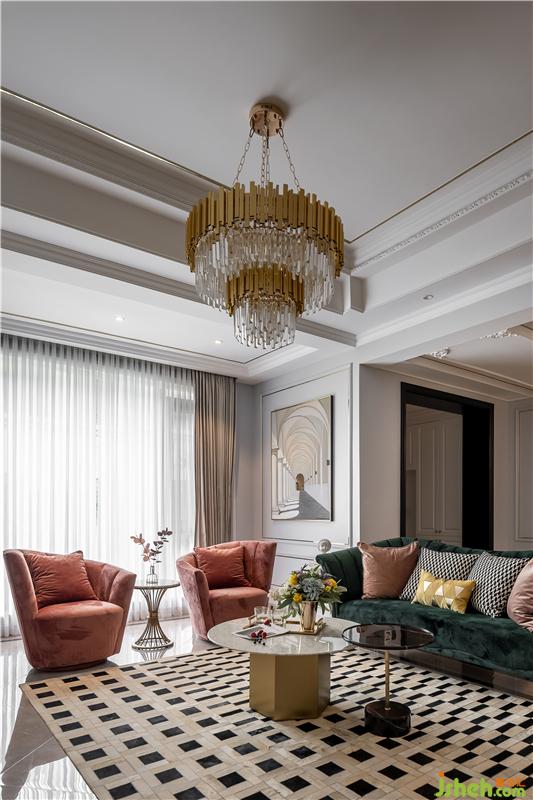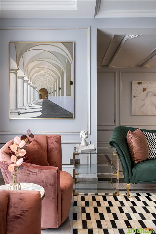 客厅选用静谧淡蓝和高贵金为主色调,搭配皮粉及墨绿色沙发,形成淡雅与尊贵的视觉冲击。
