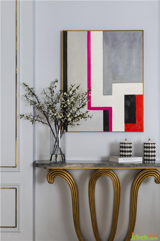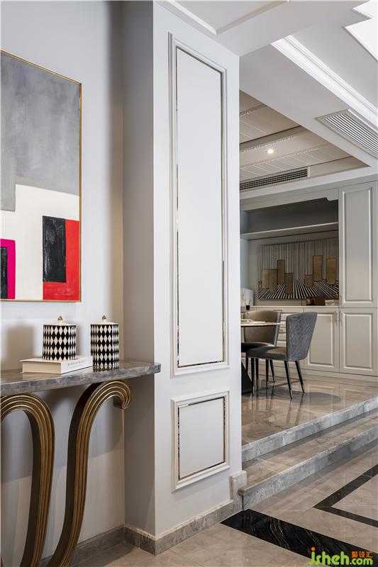 入户做了一个端景,空间上拉开视野,顶面的灯光和线条处理映衬着别有韵味的挂画,呈现出家的第一印象。