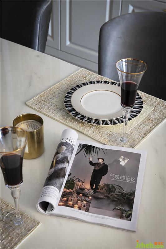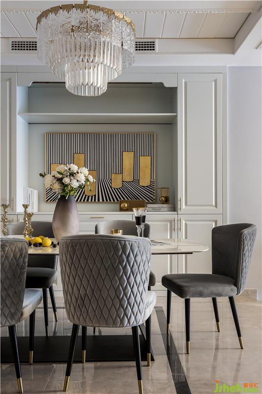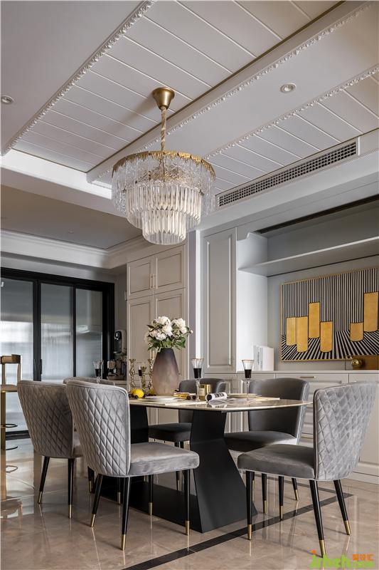 餐厅呈现的是冷暖相间的色彩,顶面优美的线条,搭配圆形吊灯,置身其中感受到的是空间本身带来的美.
