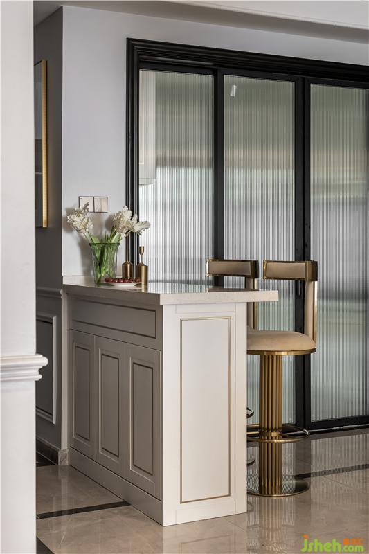 中厨与餐厅用玻璃滑门隔断,白色的花砖与地砖融为一体,橱柜的金色线条与餐区风格统一,平衡视觉效果。