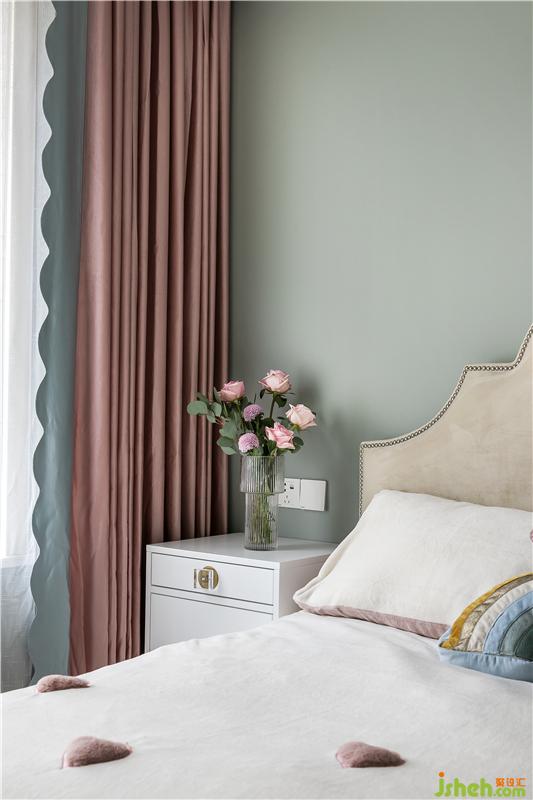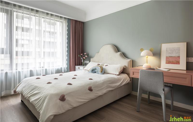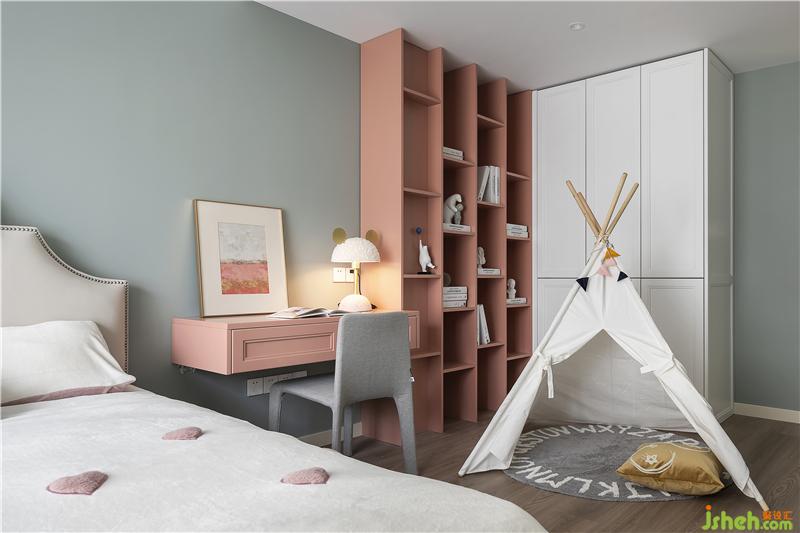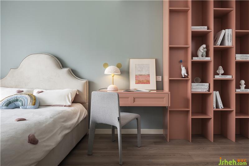 粉、灰、白、浅绿,设计师用多样的彩色为孩子打造了一个充满童趣的空间。粉色开放式展示柜可以收纳玩具,也可以藏书,功能多样,美观实用。