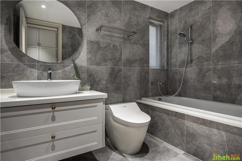 卫浴空间通铺同色系墙砖和地砖,更具延伸性。临窗设置有浴缸,忙碌了一天可以舒服地泡个澡,幸福感迅速提升。