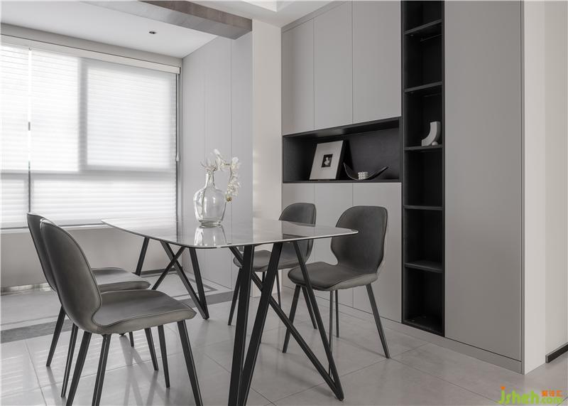 餐边柜、百叶窗、地砖用色形成呼应,简约大气。餐边柜有着超大的储物空间,柜体用小面积的黑色加以点缀,使得空间在干净的基础上更显质感。