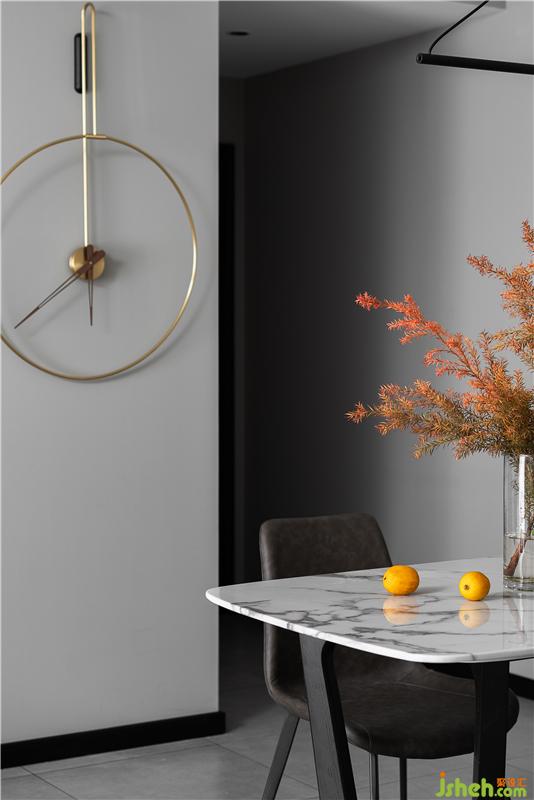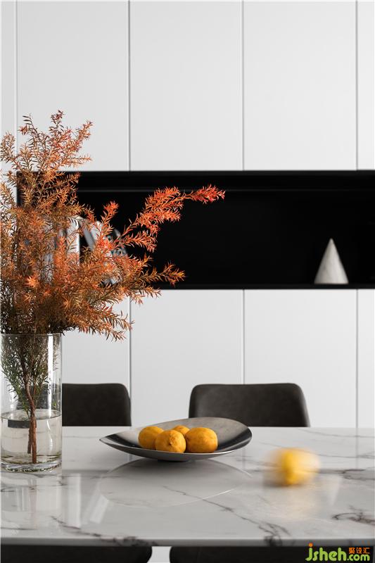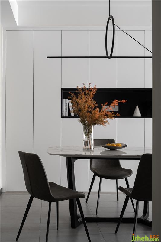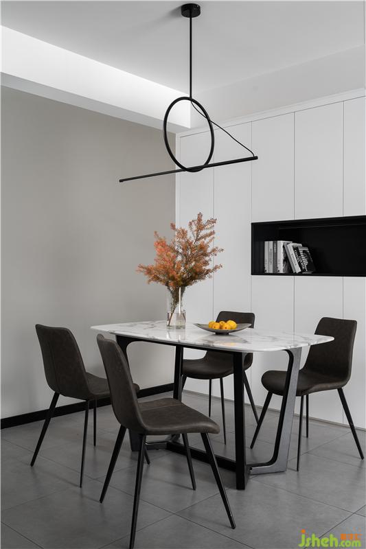 几何一字型创意艺术吊灯简洁又不失大方,装修设计搭配大理石餐桌,更具活力。餐边柜与储物柜结合,既能作为家庭储物收纳也能作为饰品展示区域,美观实用。