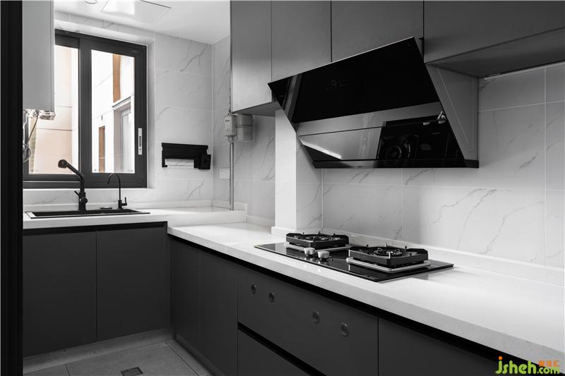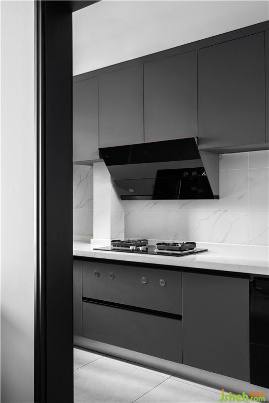l型厨房沿用了大理石瓷砖,搭配灰色橱柜,层次分明,视觉上充满流畅的美感,也增强了厨房的兼容性。