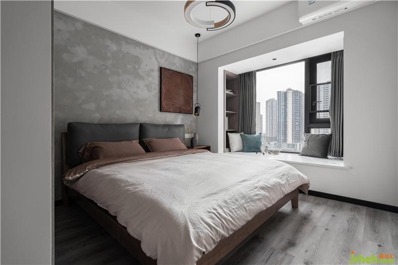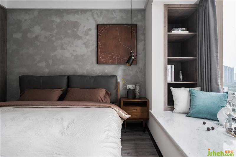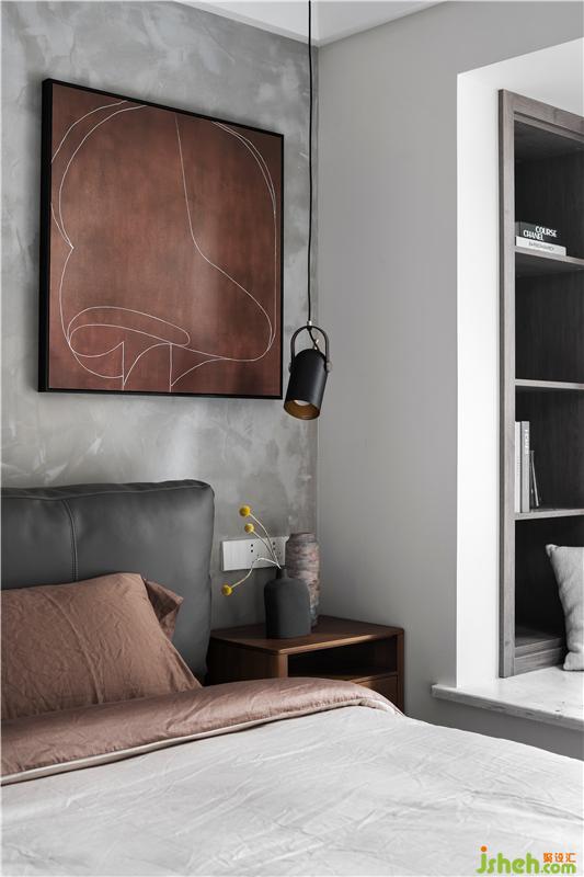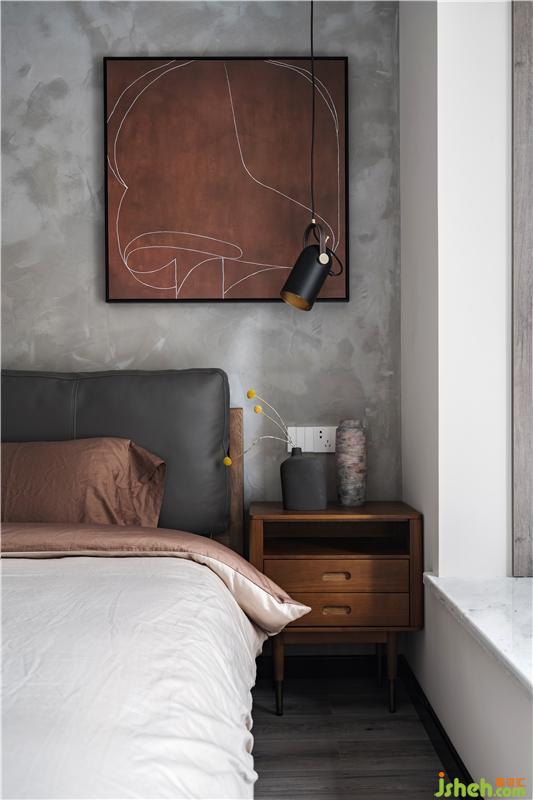 主卧室采用了水泥漆背景墙,胡桃色的装饰画与床品相呼应,皮质软包的床头造型、黑色的吊灯,为睡眠空间点缀了一些工业风,简单且富有神秘感。