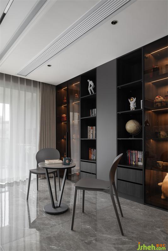 书柜不仅仅有储物功能,造型各异的摆件更是点缀出了一丝神秘感,纯黑色的柜体弥漫着淡淡的高贵气息。业主是星巴克杯子的收集爱好者,柜子里藏满了淘回家的杯子,同时,他也是一个细心又好客的人,会为来到家的朋友备好专属的咖啡杯。
