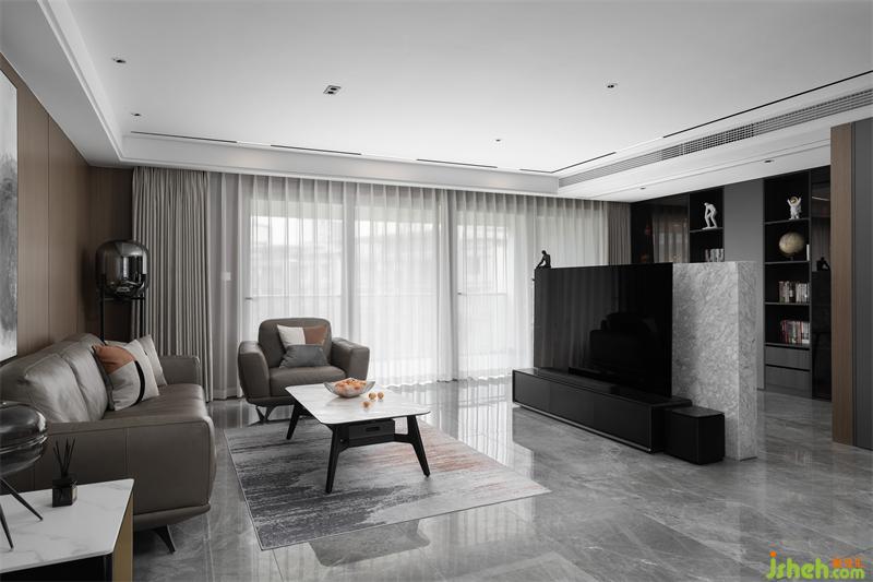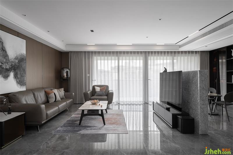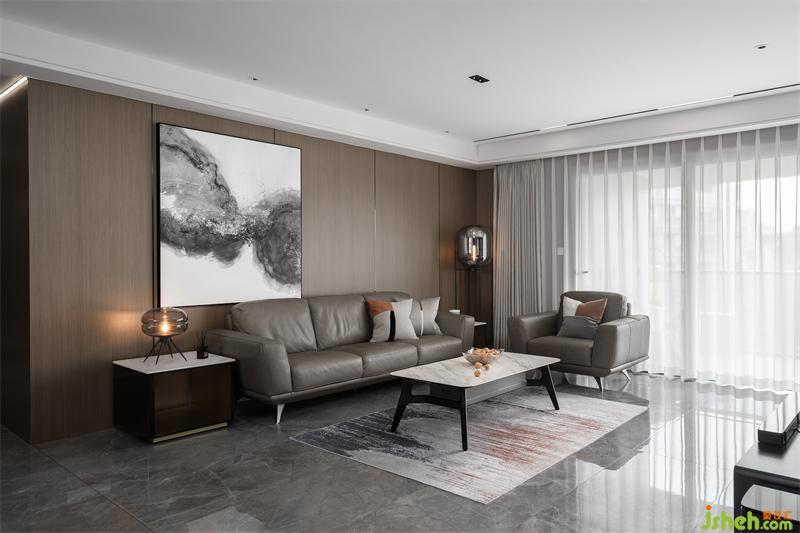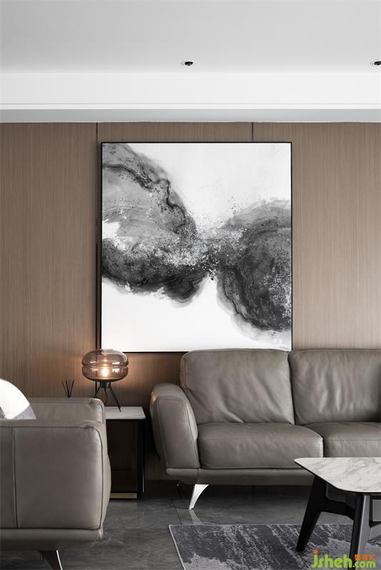人间灯火无不休,爱于山水与春秋。一涟涟的褶皱窗纱随着微风轻拂,木色的饰面板通铺整个墙面,灰棕色的皮质沙发与整个客厅融为一体,极具中国风的水墨画跃然纸上,灵动又尽显张力。