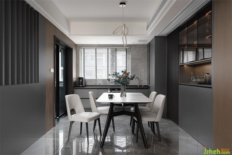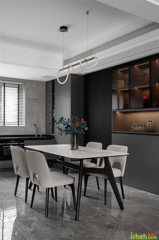 简约深色的竖栅格板,整齐划一,既美观又让空间质感更丰富。通顶的餐边柜,方便放置精致的器皿、餐具、美酒,美观而实用。