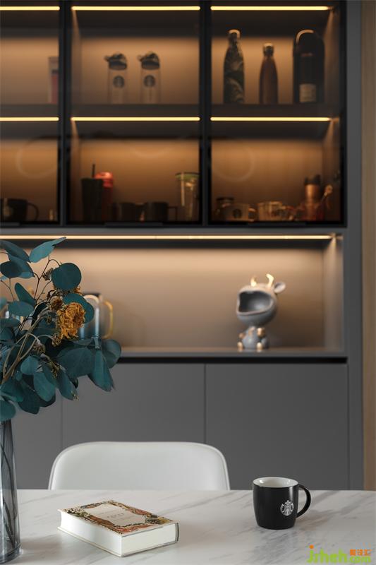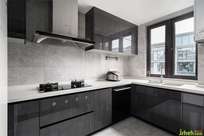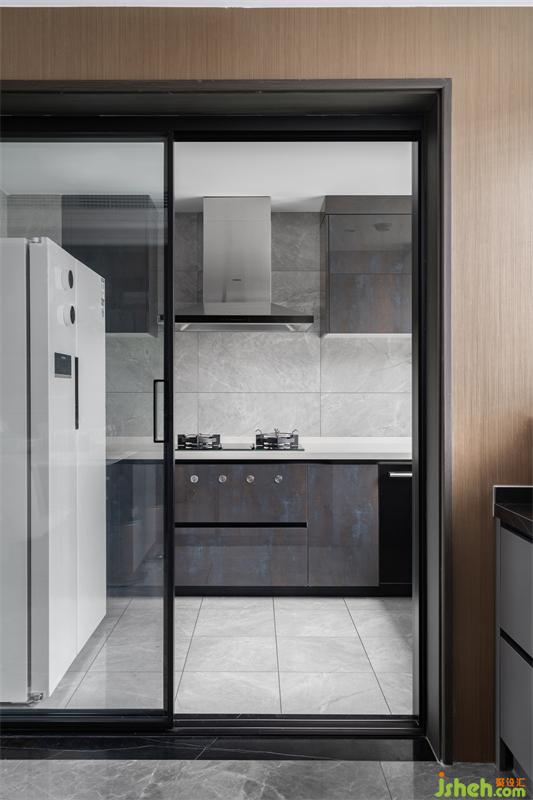 厨房采用了推拉门的设计,使用起来更灵活,还节约了空间。柜体主打黑、灰两色,呈现出简单干净的空间。