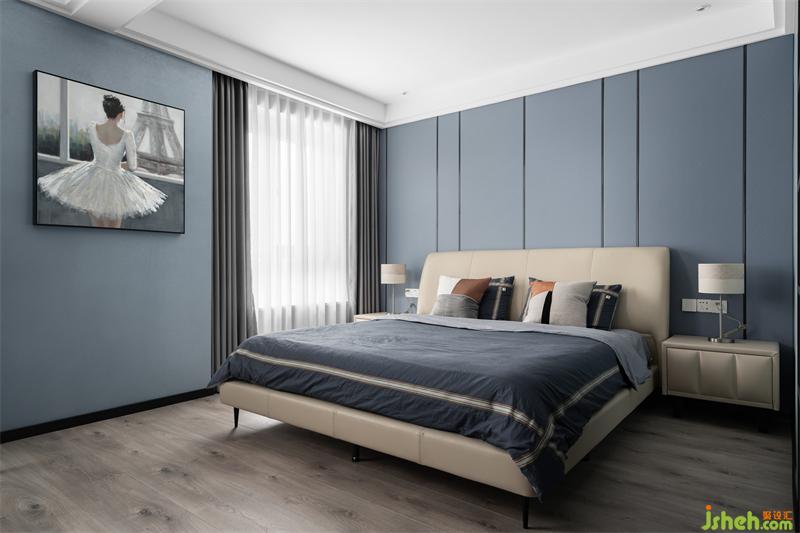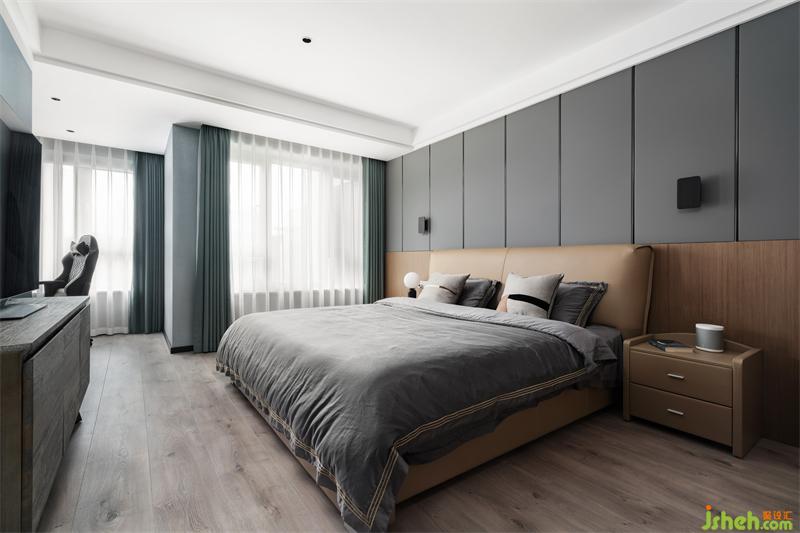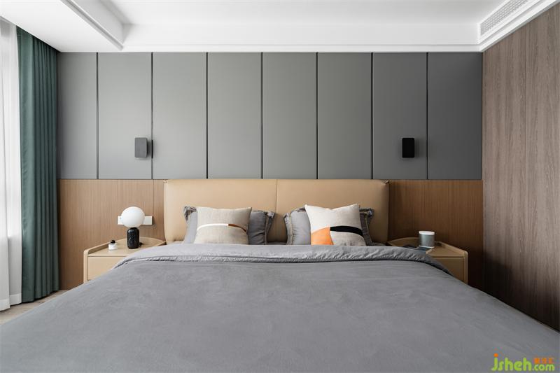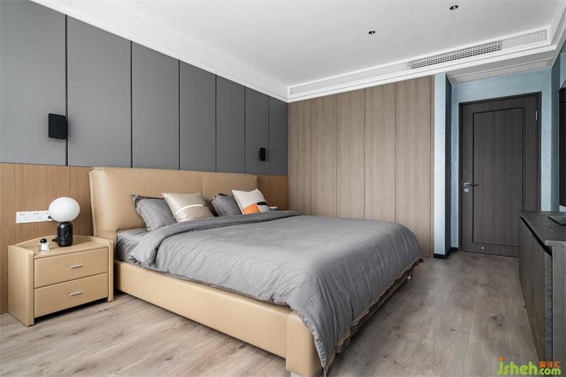 卧室铺设了木地板,舒适自然;床头背景墙采用了莫兰迪灰硬包+原木色饰面板,看起来清新舒爽,营造出轻松、安逸的氛围感。