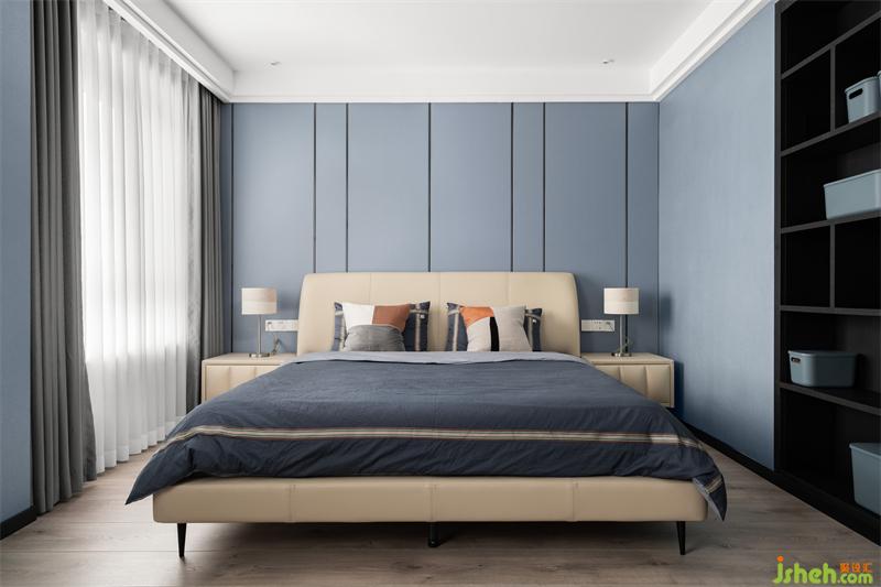 业主十分喜欢蓝色,次卧大面积运用蓝色,让人仿佛置身于一片汪洋大海,嵌入墙体的储物柜,让闲置物品、书籍都有了容身之处。