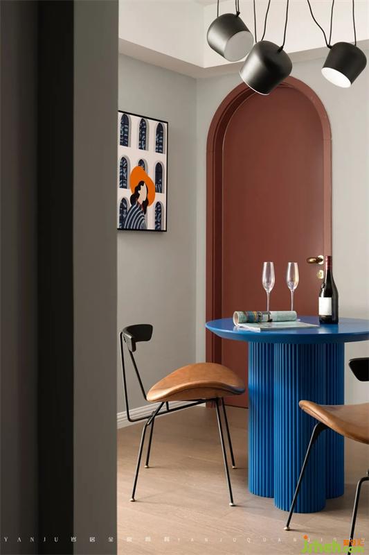 The layout of the restaurant is very clever. It is neither a traditional open nor a closed one. The semi-open style cleverly divides the guest dining room and the home, and the three are properly integrated: the flow from the kitchen is reasonable, which is convenient for the residents to use; it is semi-integrated into the living room, The area is increased visually, making the space flexible and tactile.