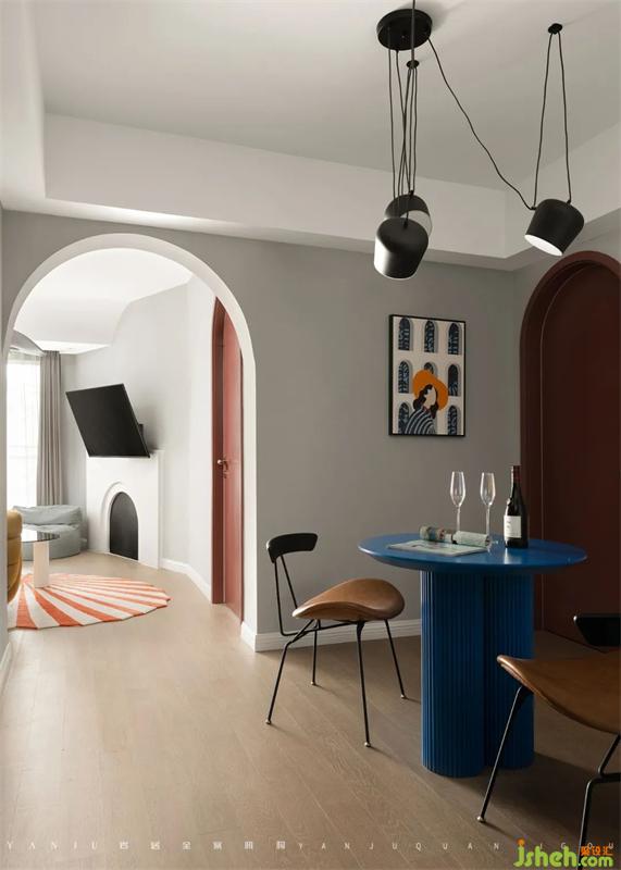 拱门的设计让光源充分引入餐厅,整屋大量使用业主喜欢的金色、蓝色、黄色元素,视觉上鲜明而不过分耀眼。