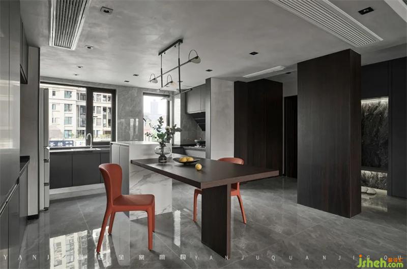 The island table and the dining table are integrated and customized. The combination of high and low shades makes the space more three-dimensional, and the addition of orange dining chairs makes the gray space smart and lively. On the wood veneer of the western kitchen island, natural veneer is used instead of technical veneer, which makes the visual effect more natural and soft.