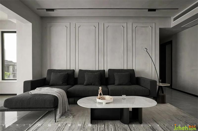 在色彩搭配上,整体空间以饱和度低的浅灰色为背景,主题色为深灰,以白色岩板做对比色来提亮空间,用烟熏木纹做为下沉色,让空间更显细腻和具有温度。