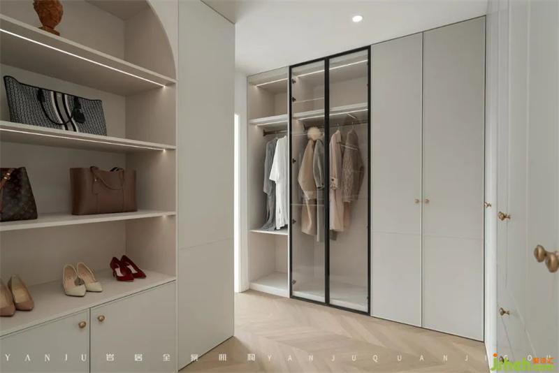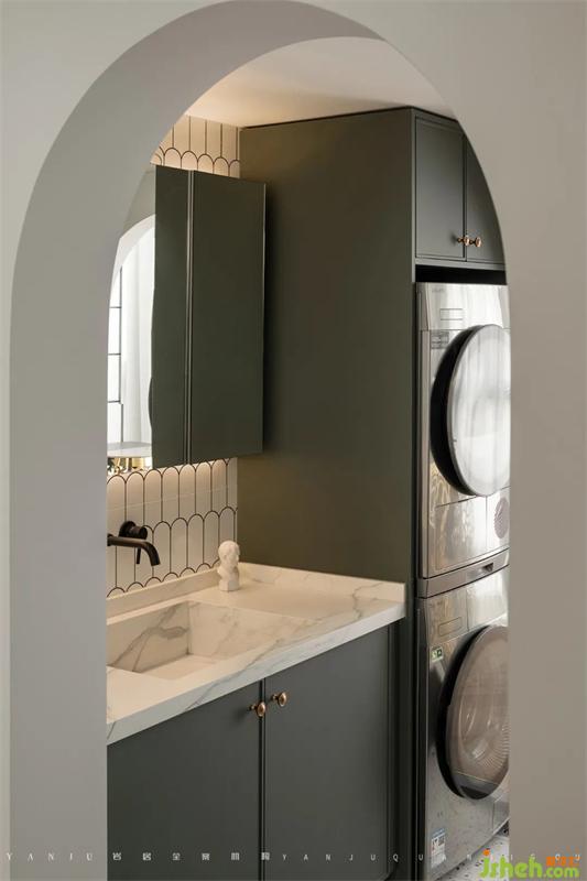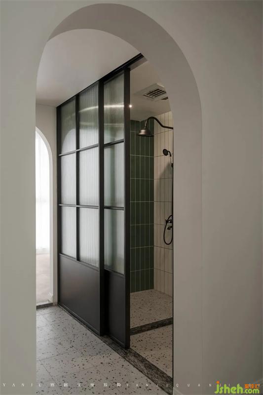 书房是由之前的露台空间改造而来的,穿过两个拱形门洞的通道,右侧是淋浴间和马桶间,造型门扇既保证了私密性也有美观性。往里走,进入到的是独立安静的书房空间。