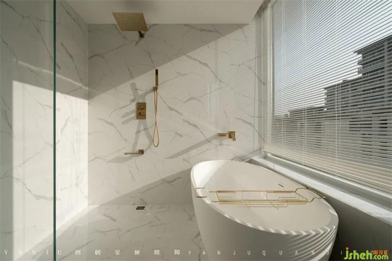 浴缸设计在靠窗的位置,阳光透过百叶帘洒进来,温暖地泡个澡很是惬意。夜晚点上香薰蜡烛,加上顶面的氛围灯,也不失仪式感和小浪漫。